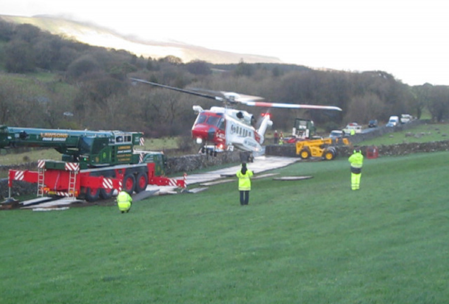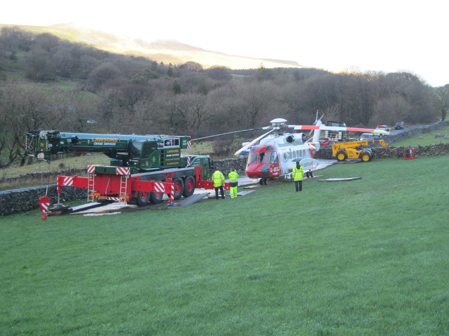 G-MCGJ finally got airborne about lunchtime today, and has now returned to her base in Caernarfon. Good work by the technicians and aircrew, Lawson’s Crane services and ourselves providing manpower and lower tech support as needed.