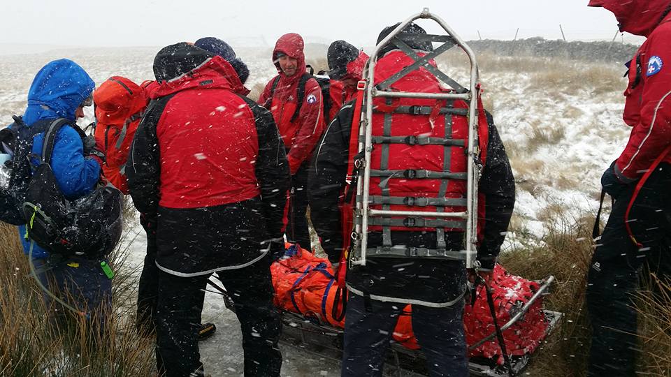In wintery conditions, a walker (f, 42) slipped on ice descending from the summit, and sustained a fracture to her right tibia and fibula. The casualty was attended to by team casualty carers, given pain relief and splinted before being carried on a stretcher to the road, for transfer to a road ambulance for transport to hospital. Volunteer hours:48